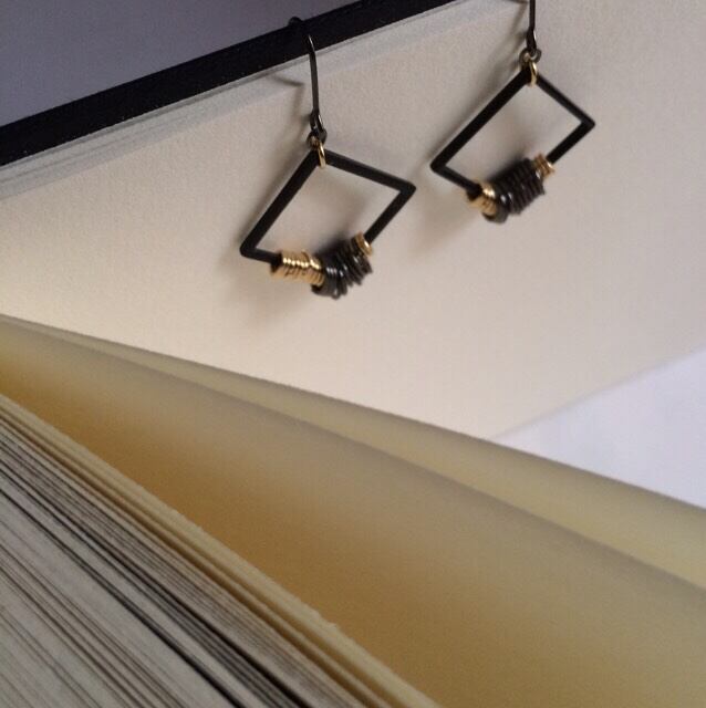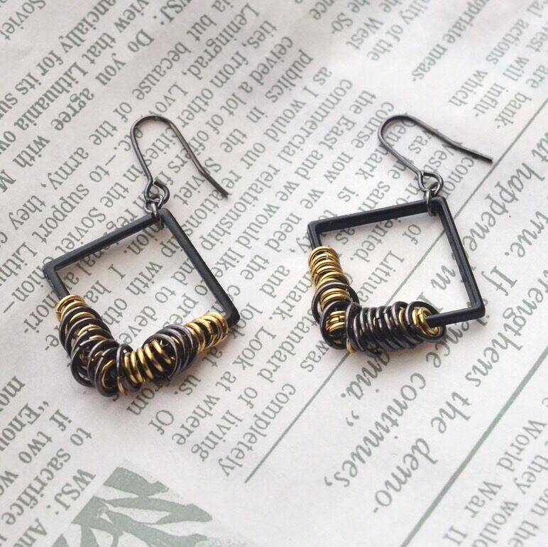 スクエアのパーツに2色の大小の丸カンをあしらったピアスです。丸カンは固定されておらず揺れる度に表情が変化します。シックなカラー配色で大人っぽく着けていただけます。