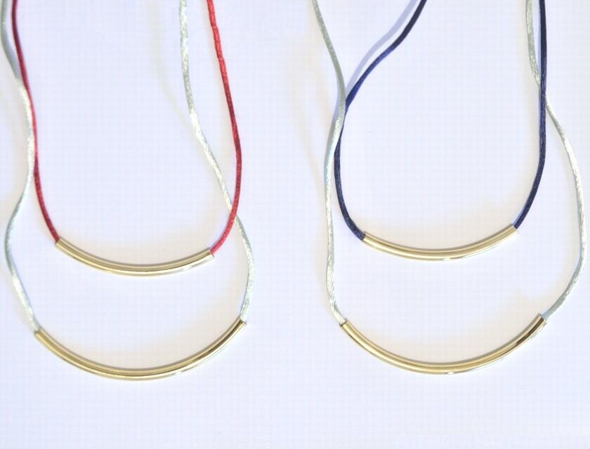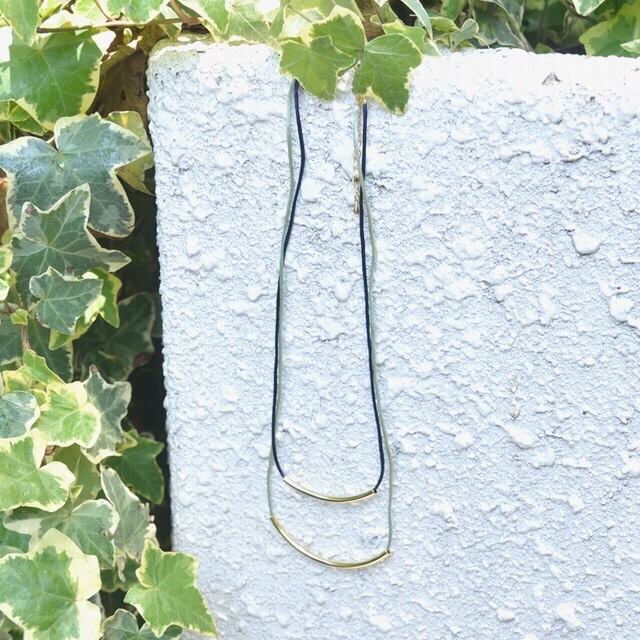 ゴールドの丸パイプのパーツとレーヨンの紐を組み合わせた2連のネックレスです。異なるカラーの組み合わせがあります。